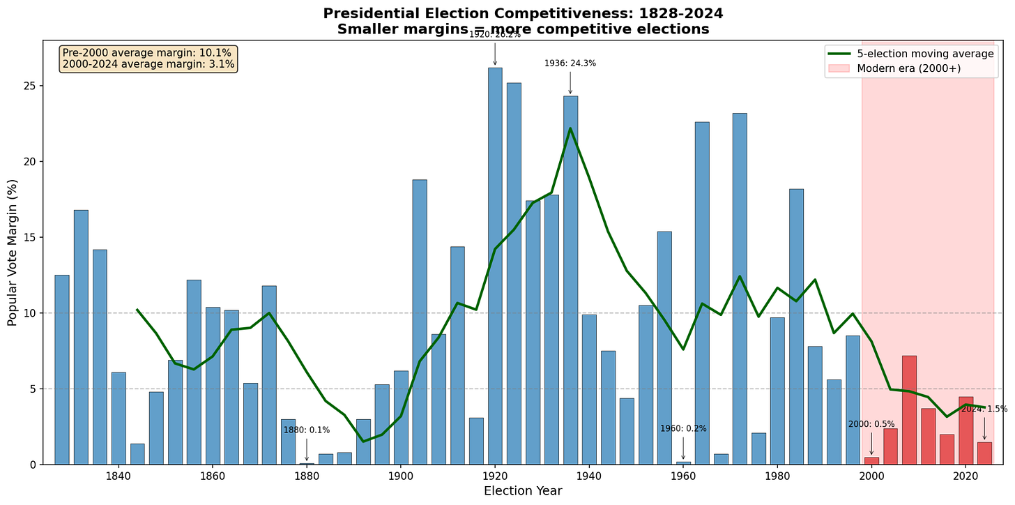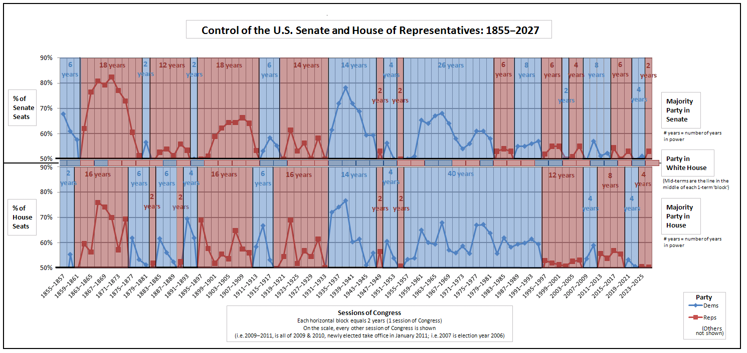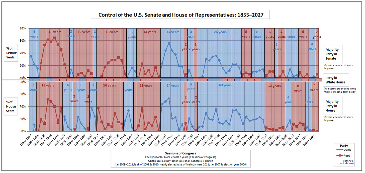 Today we’re in an era of highly competitive partisan politics, perhaps the most competitive in our country’s history. It’s rare for Presidential elections to be regularly this close and for control of both the Presidency and Congress to swing back and forth so frequently. We’re far from the 1890s era of Republican dominance.